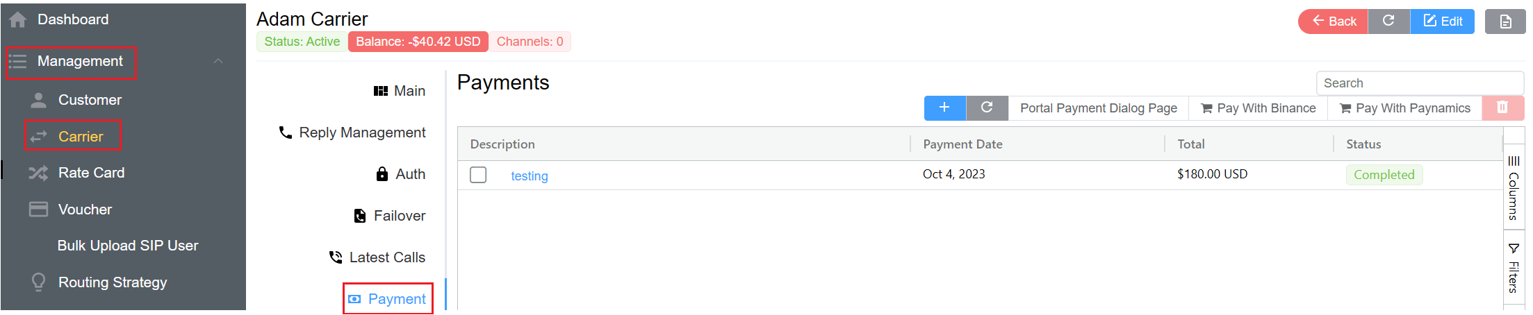 The Payment tab shows payments made to the carrier. To add a new payment, click , fill in the payment information, and then click Save
