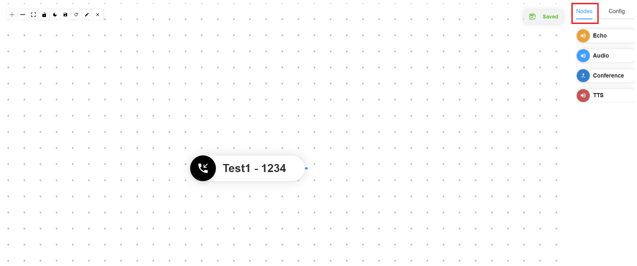 - After saving, the Call Flow Editor appears. This editor provides a canvas with draggable nodes you can connect to build your application logic.