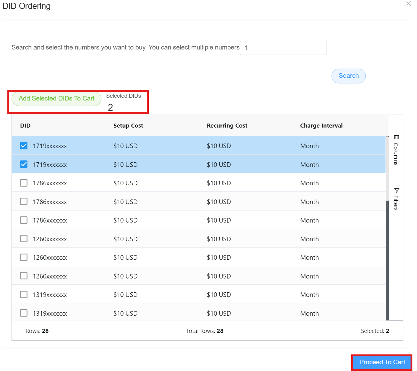 - Select the DIDs you wish to purchase, click on Add Selected DIDs To Cart, then Proceed to Cart.