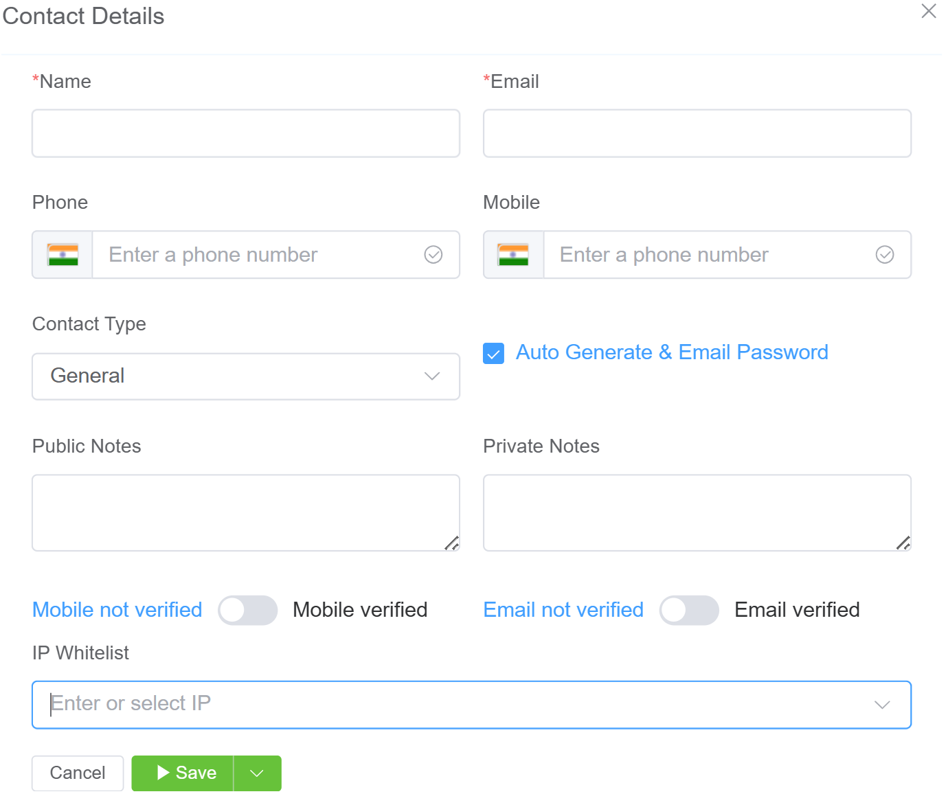 Auto Generate & Email Passwordto email the random password to the contact's email address, or deselect it and enter the password manually. If auto-generate is disabled, an administrator must manually set a password. Save.