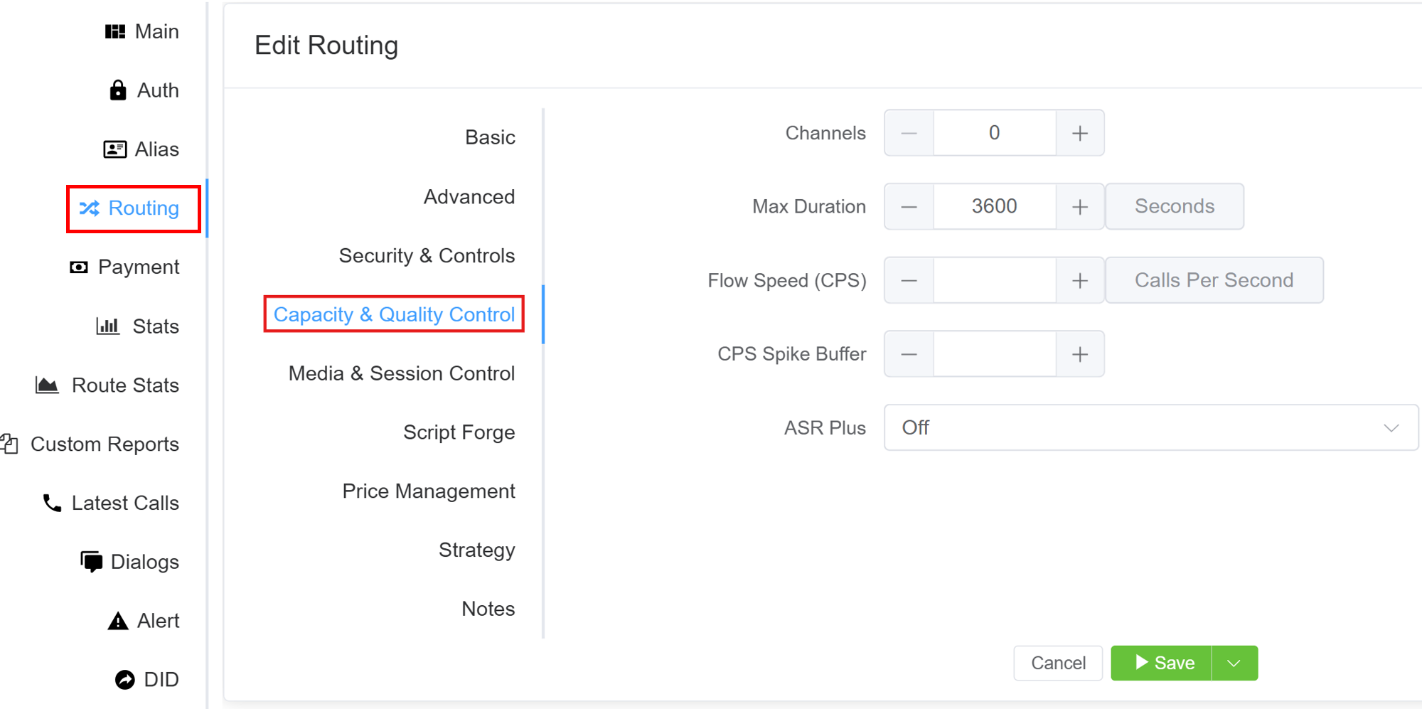 Channels: Set the maximum number of channels/live calls allowed for this route.