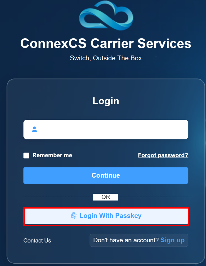 email(ConnexCS). Click onLogin With Passkey.