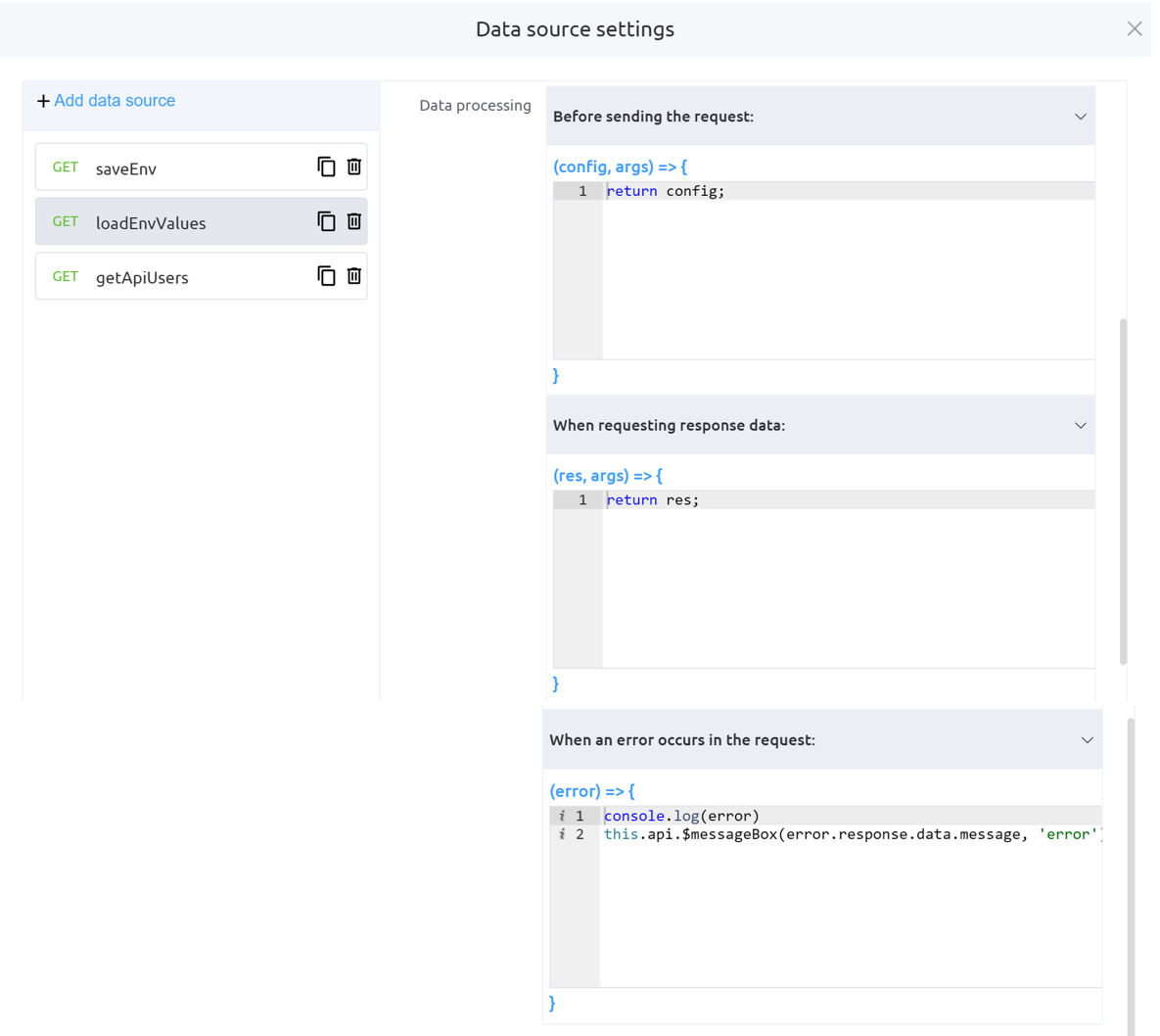 /** * Asynchronously saves environment variables based on the provided data. * * @param {Object} data - The data object containing environment variable values. * @param {string} data.api_user - The API user value to be set. * @param {string} data.class4_server - The Class 4 server value to be set. * @param {string} data.class5_server - The Class 5 server value to be set. * @returns {Promise<Object>} A promise that resolves to an object with a status property indicating the result. */ async function saveEnv({ envValue }) { try { for (const [key, value] of Object.entries(envValue)) { await setEnvVar(key, `${value}`) } return { status: 'OK' } } catch (error) { throw new Error(error.message) } } /** * Asynchronously loads environment variables and returns an object containing specific server and user values. * * @async * @function loadEnvValues * @returns {Promise<Object>} An object containing the following properties: * - class4_server {string}: The value of the C4SERVER environment variable. * - api_user {string}: The value of the cx_api_user environment variable. * - class5_server {string}: The value of the C5SERVER environment variable. */ async function loadEnvValues() { const vars = await getEnvVars() return { api_user: vars.cx_api_user, currency: vars.currency, did_mask_size: vars.did_mask_size, } } -
