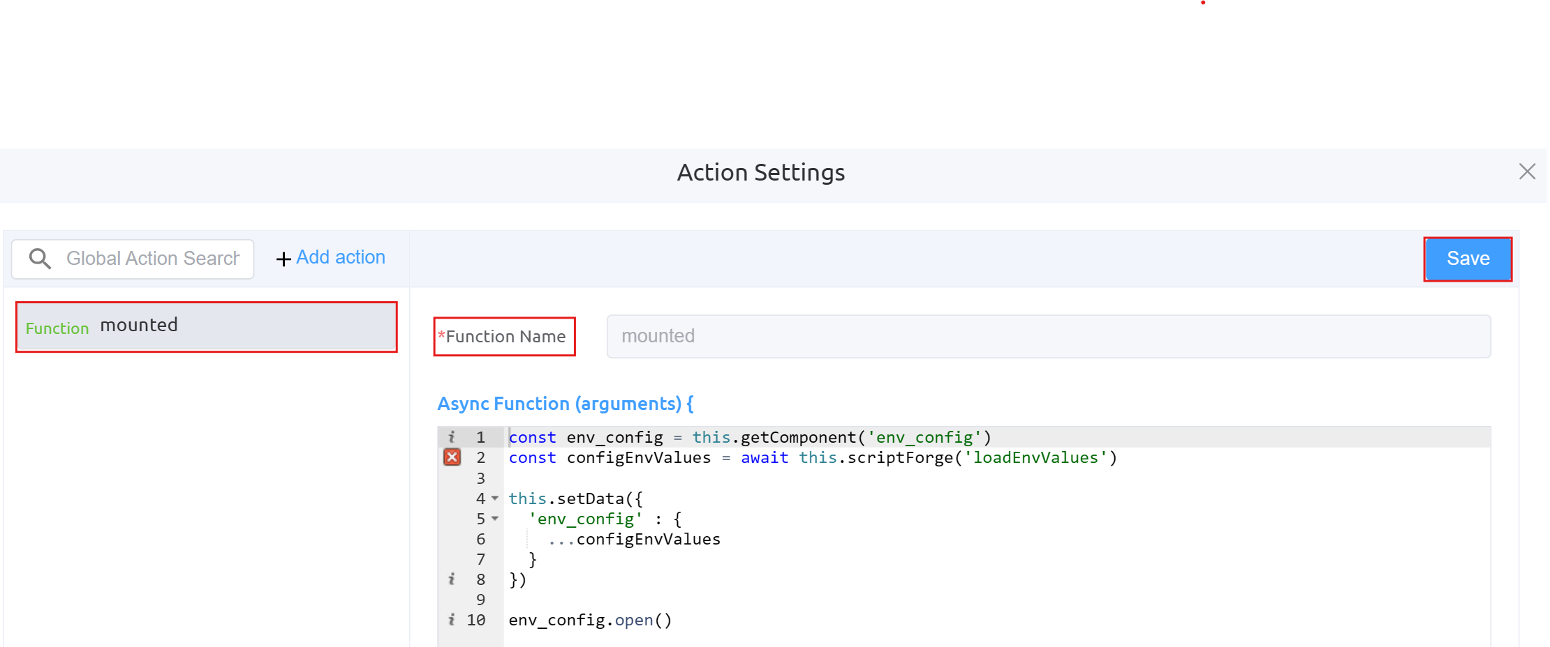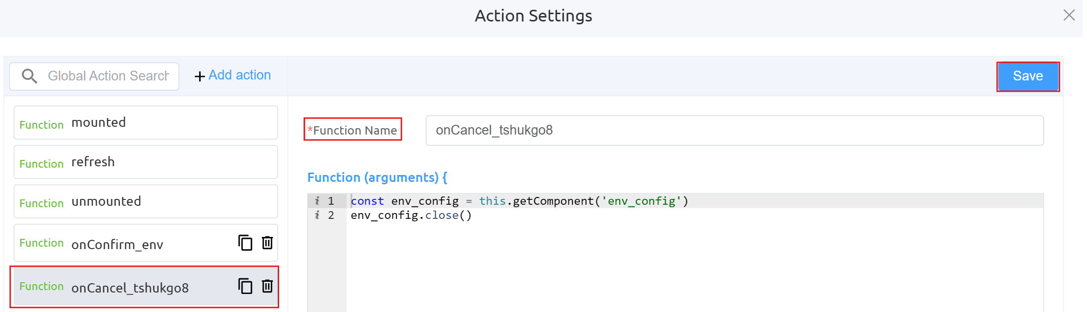 Field Description Type Defines the component type (here, a Dialog popup). ID Unique identifier used to reference this dialog in logic or actions ( env_config).Title The heading displayed at the top of the dialog. Width Controls the width of the dialog (e.g., 35rem).Visible Toggles whether the dialog is shown or hidden. Center Aligns the dialog to the center of the screen if enabled. Show Close Displays a close (X) button on the dialog. Show Cancel Button Enables the Cancel button at the bottom. Button Text (Cancel) Defines the label for the Cancel button. Show Confirm Button Enables the Confirm button. Loading (Confirm) Shows a loading state on the Confirm button during processing. Margin Top Adds spacing from the top of the screen (e.g., 15vh).Prevent Escape Key Close Disables closing the dialog using the Escape key. Custom Class Allows applying custom CSS styling to the dialog. Attribute Action (Data Binding) Enables binding the dialog data dynamically to variables or state. Action Settings Action Description onCancel Defines what happens when the Cancel button is clicked (e.g., close dialog or reset state). onConfirm Defines what happens when the Confirm button is clicked (e.g., save environment variables). -