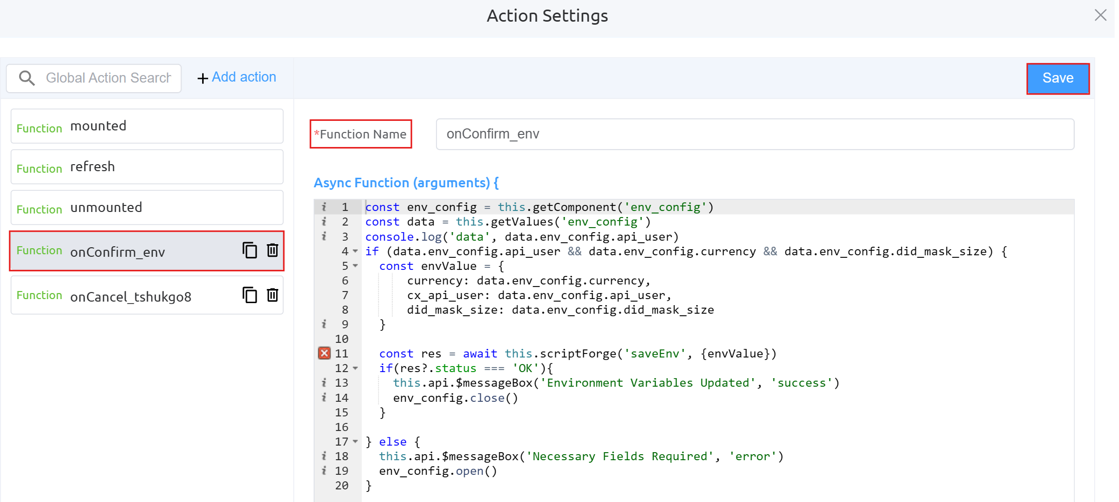 Action Description onCancel Defines what happens when the Cancel button is clicked (e.g., close dialog or reset state). onConfirm Defines what happens when the Confirm button is clicked (e.g., save environment variables). Configure the Form Attributes, which are applied at the file level and affect all components within the form, ensuring consistent layout, styling, and behavior across the entire UI.