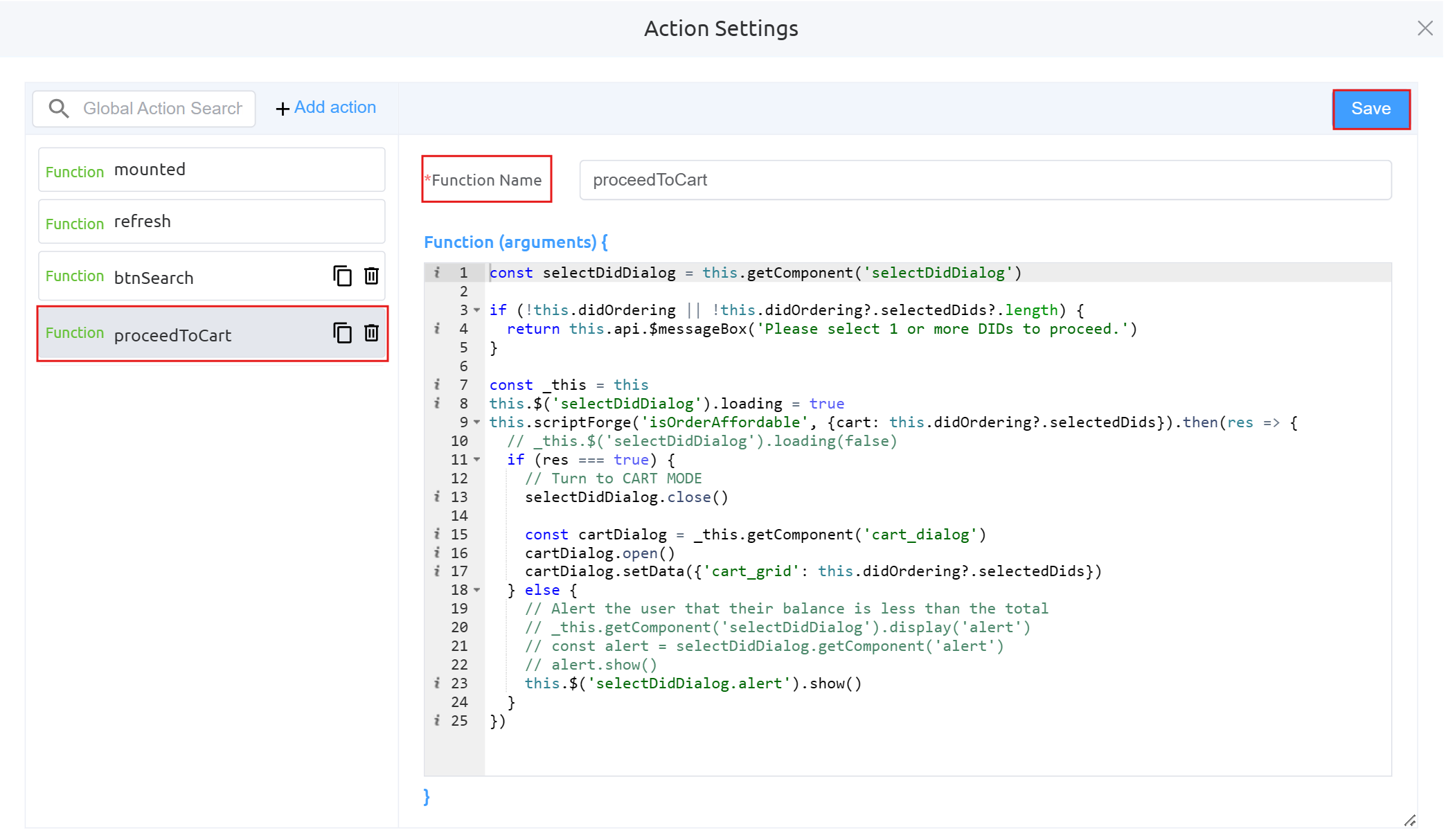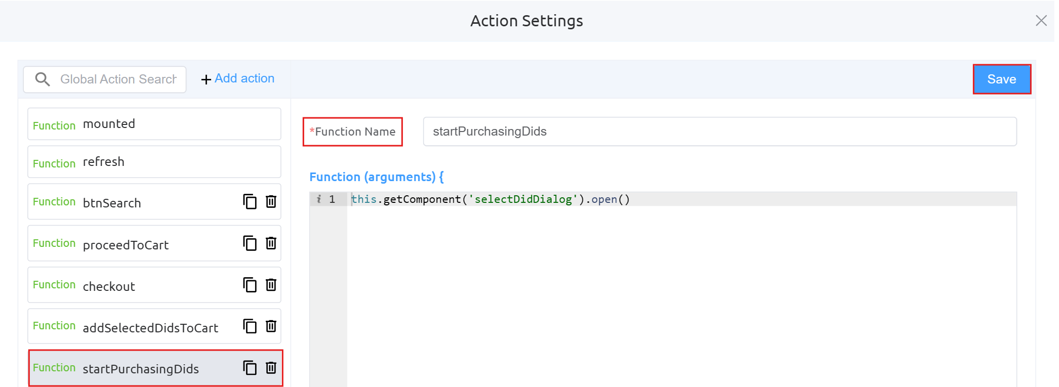 Next step is to configure the DID Ordering UI using Page Builder. This interface is a composite UI built using multiple Page Builder components that allows users to search, select, and add DIDs to cart, while handling validation (e.g., insufficient balance).