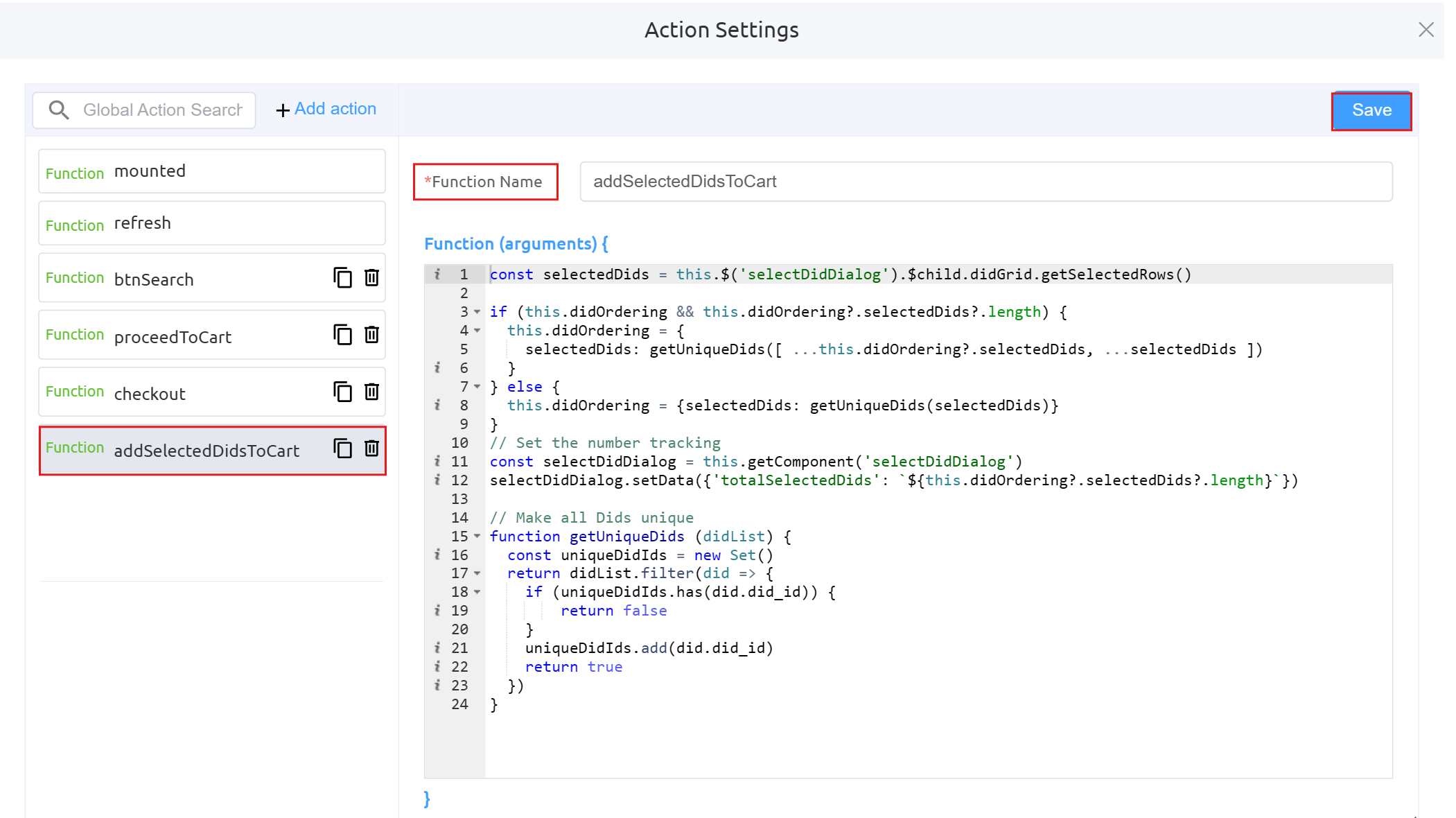 Field Description Button Name Add Selected DIDs To Cart. Type Styled as success (green). onClick Adds selected rows from grid to cart. Functionality Updates cart state and selected DID count. Selected Count Display