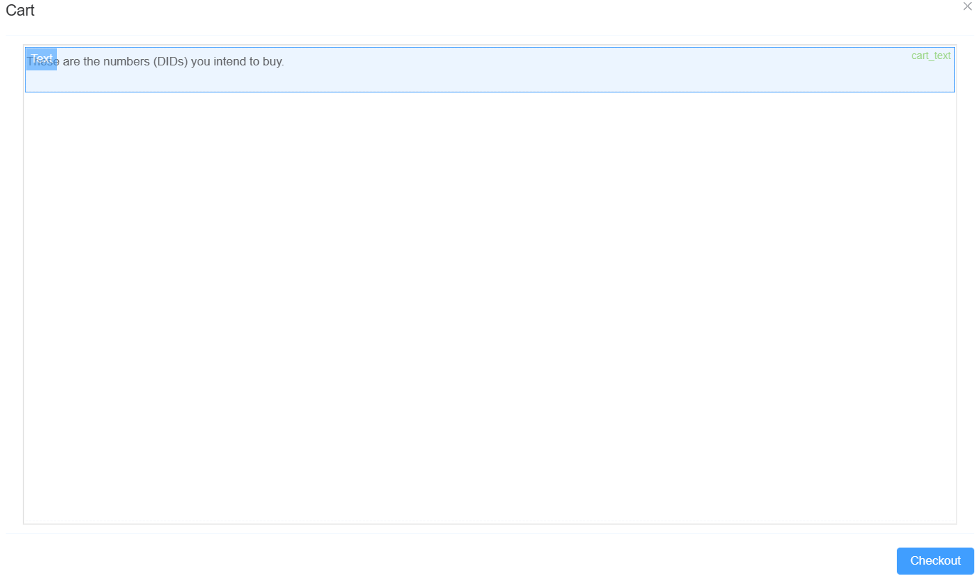 Field Description Type Defines the component type (Text). ID Unique identifier used to reference this component ( cart_text).Name Internal reference name (optional). Width Controls the width of the text component. Label Width Defines label width (custom set to 40).Label Wrap Allows the label text to wrap onto multiple lines. Hide Label Toggles visibility of the label. Text Prompt Optional helper or descriptive text. Default Value The default text displayed (e.g., "These are the numbers (DIDs) you intend to buy."). Custom Class Applies custom CSS styling. Attribute Action (Data Binding) Enables dynamic binding of text content to variables or state. Hidden Controls visibility dynamically when enabled. Validation (Required) Marks the field as required (not typically used for static text). Action Settings Action Description onChange Defines behavior when the text value changes (rarely used for static text components). -