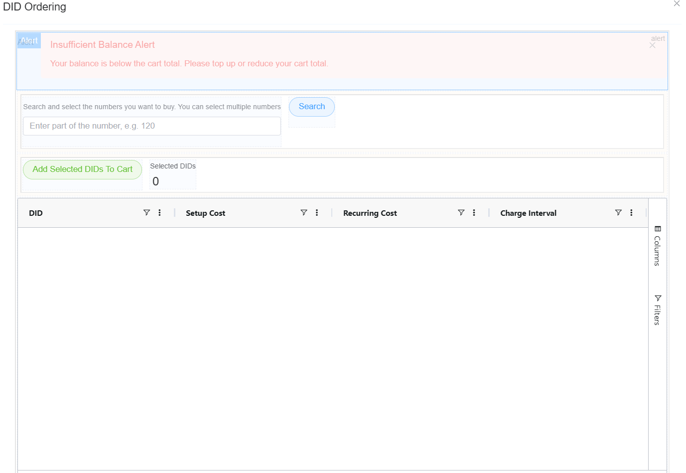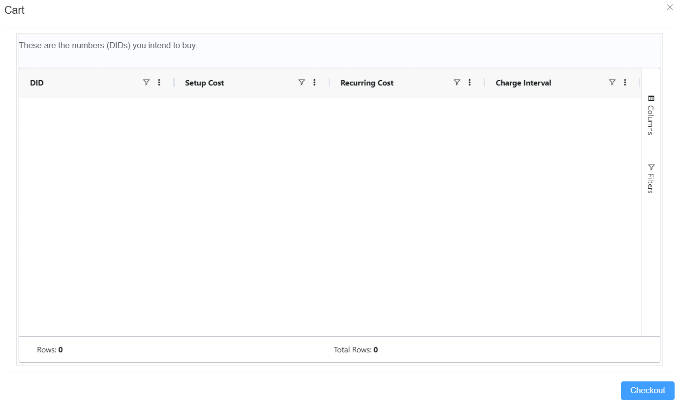 Field Description Columns DID, Setup Cost, Recurring Cost, Charge Interval. Filters Allows filtering of available numbers. Column Settings Enables column visibility customization. Row Selection Allows selecting multiple DIDs. Data Source Populated via search/API. Interaction Selected rows used for cart actions. Action Flow