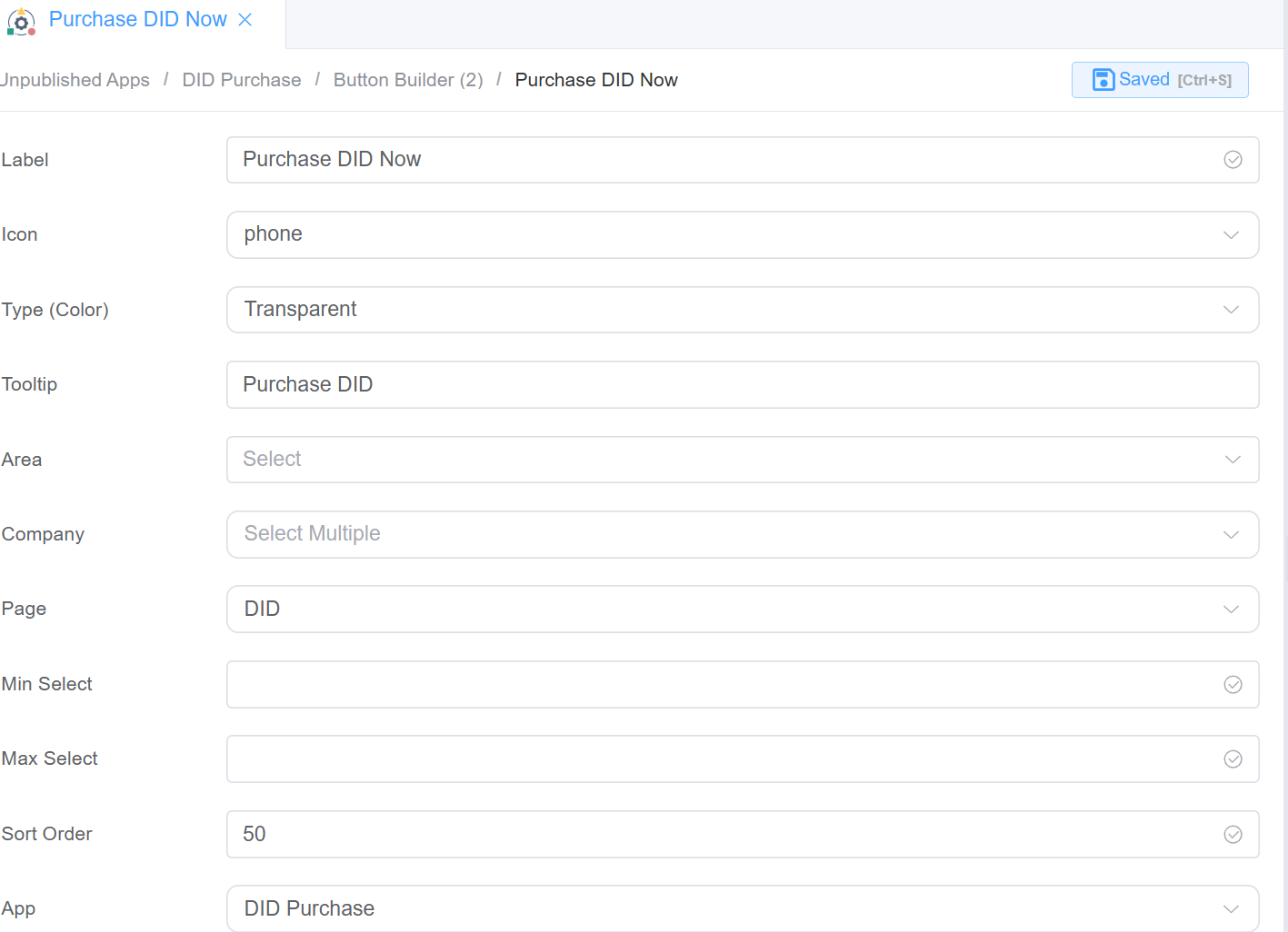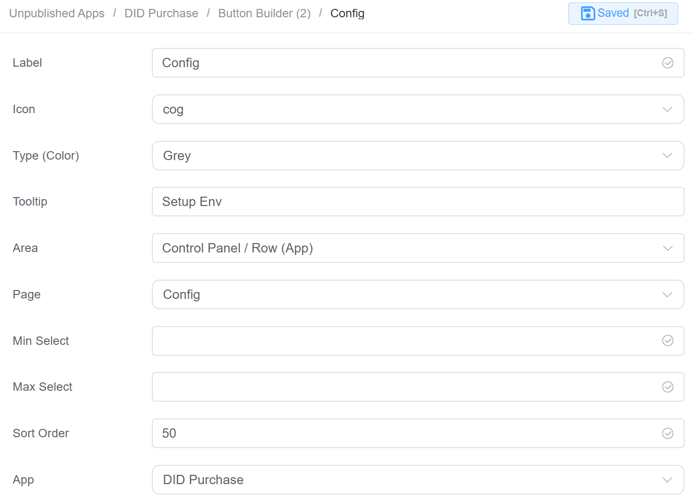 Label: The display name of the button.Icon: The icon shown alongside the button label.Type (Color): Defines the button color/style.Tooltip: A short description shown when users hover over the button.Area: Determines where the button will appear in the UI.Page: Specifies which page opens when the button is clicked.Min Select: Minimum number of items a user must select before the button becomes active.Max Select: Maximum number of items allowed for selection when using the button.Sort Order: Controls the position of the button relative to other buttons.App: Specifies which application this button belongs to.