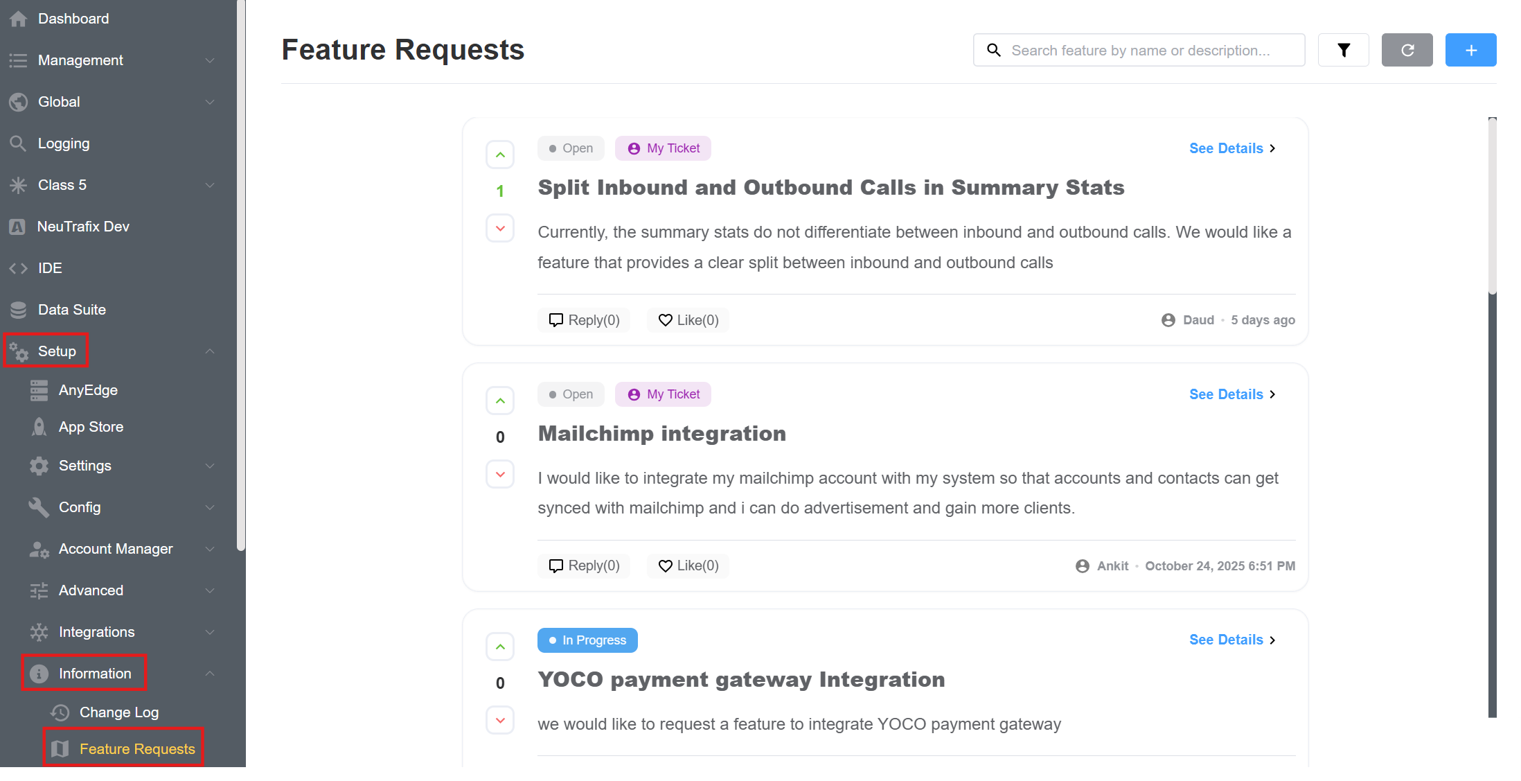 - Like: Users can express their interest in the feature request by "liking" it. This helps prioritize the most requested features.