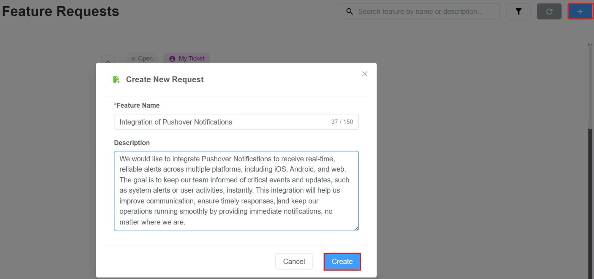 +button. When submitting a request, users need to provide:- Title: A brief, descriptive name for the feature request.