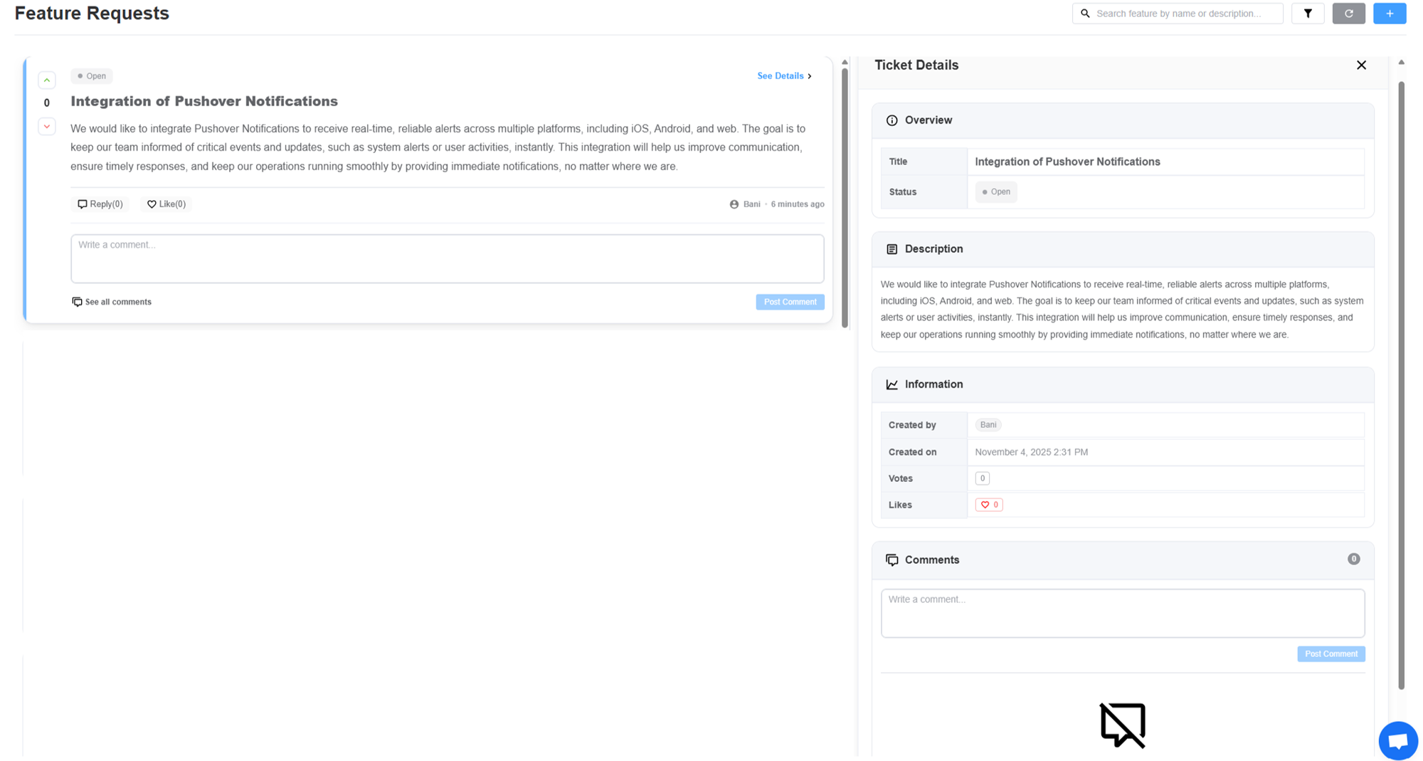 - Ticket Details panel displays basic info about the feature request, including Created By, Created On, Votes, and Likes, while the Comments Section allows users to add feedback, view all comments, and engage in discussions.