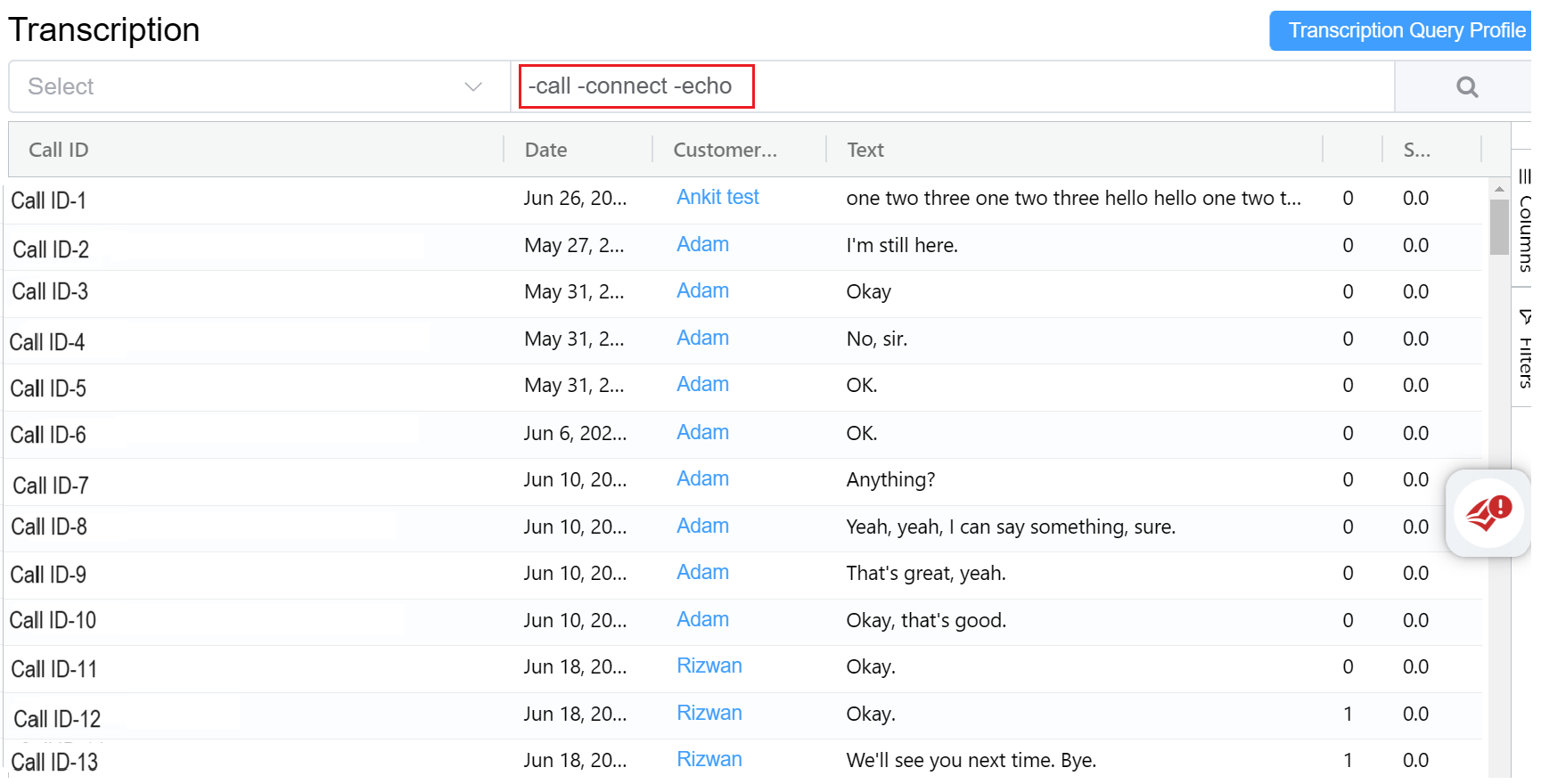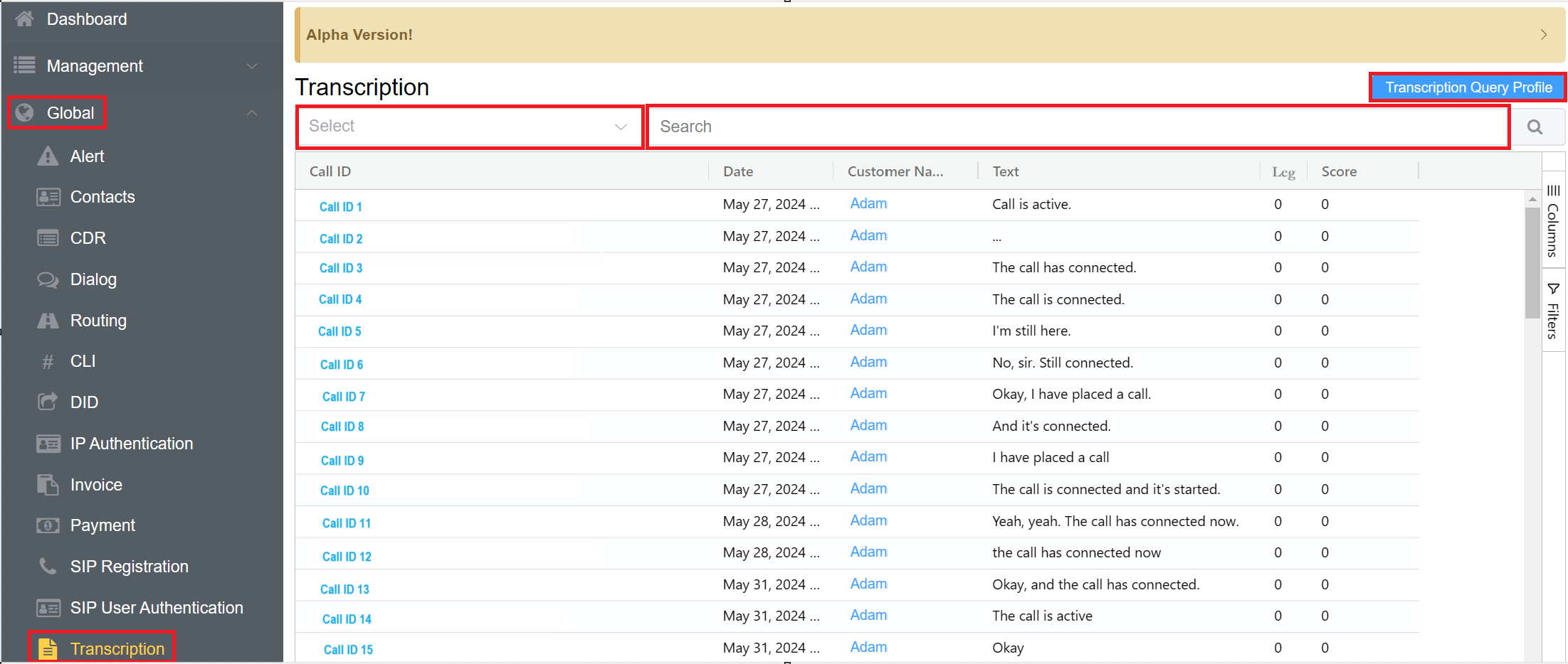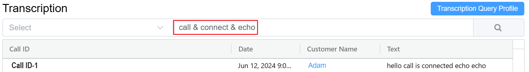 - Select: You can select a particular query profile built using the Transcription Query Profile.