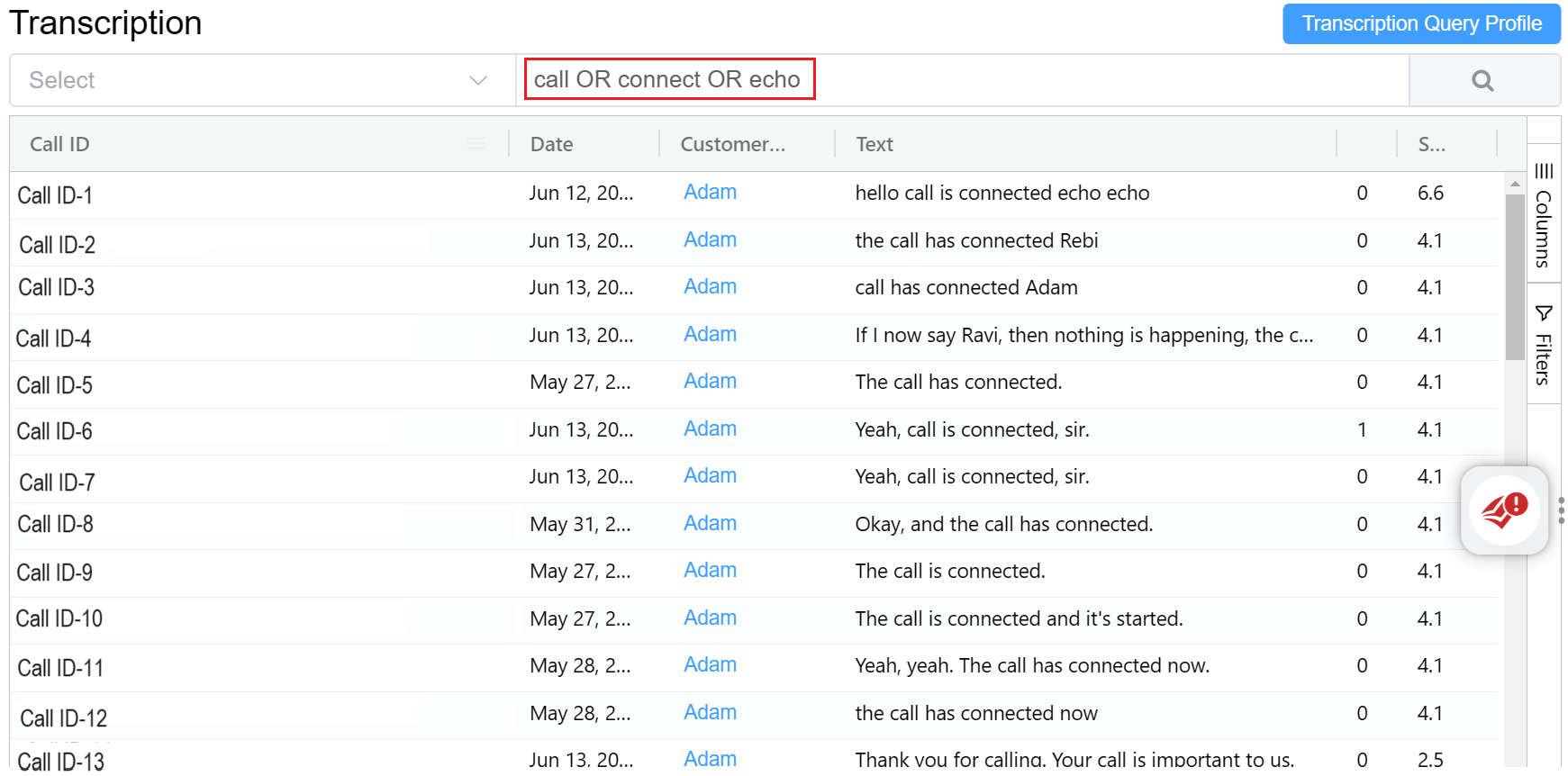 You can search the created query list for the transcribed calls.