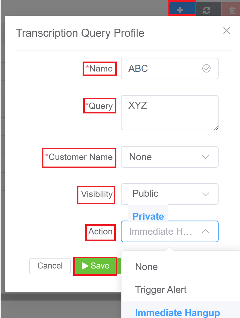 Action: Allows you to either Trigger Alert when the phrase is detected or Hangup the call if that particular phrase is detected in the call.